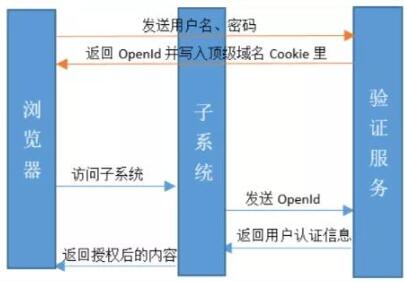 这种单点登录将用户的身份标识信息简化为OpenId存放于客户端,当用户登录某个子系统时,将OpenId传送到服务端,服务端根据OpenId构造用户验证信息,多用于C/S与B/S相结合的系统,流程如下: