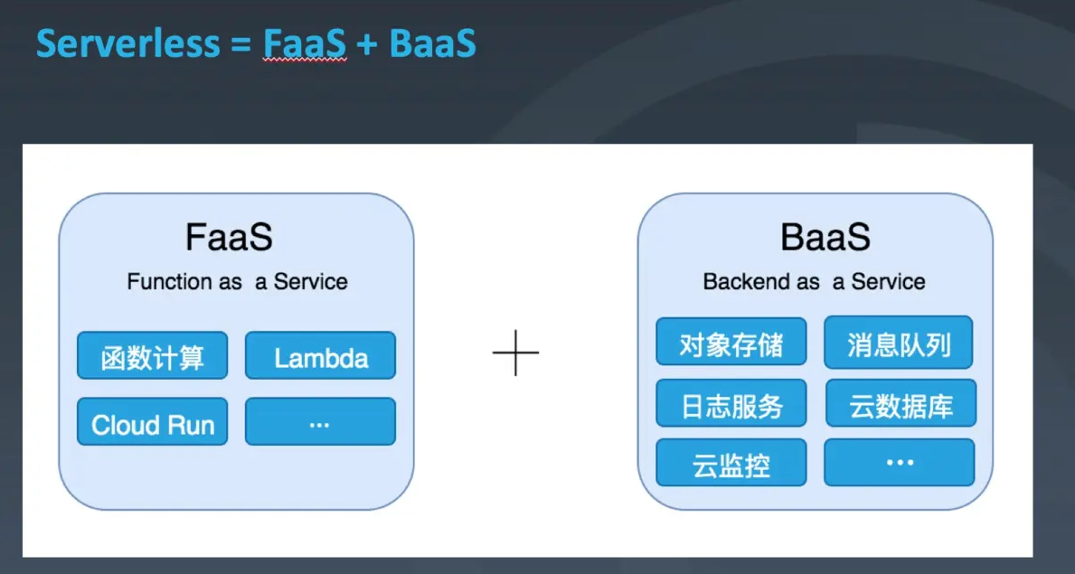 从技术层面来说,我们可以简单理解为:Serverless = FaaS + BaaS。一个完整的Serverless应用一般由FaaS层的云函数负责无状态的计算,由BaaS层组件负责状态的维护: