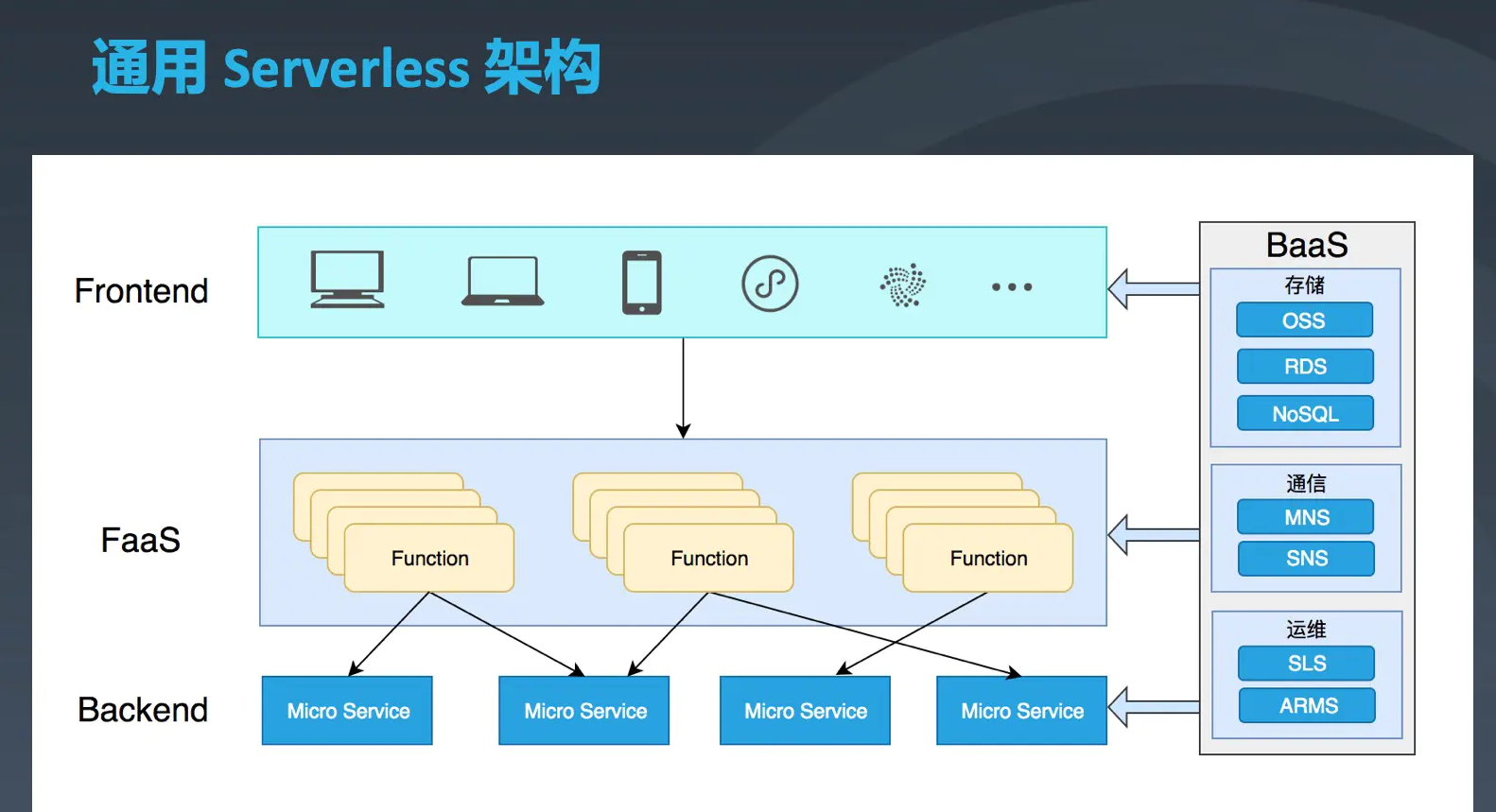 其中最底层就是实现复杂业务的后端微服务(Backend)。然后 FaaS 层通过一系列函数实现业务逻辑,并为前端直接提供服务。对于前端开发者来说,前端可以通过编写函数的方式来实现服务端的逻辑。