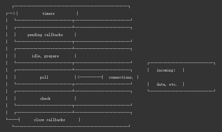 在每次运行的事件循环之间,Node.js 检查它是否在等待任何异步 I/O 或计时器,如果没有的话,则完全关闭。